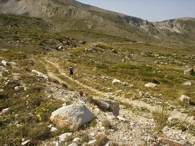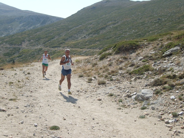 Yokuş neredeyse 5 km. sürdü. Sonlara doğru eğim biraz hafiflemişti. 5 km’de yaklaşık 400 metre yükseğe çıkmış, 2.114 metreye ulaşmıştık. Bu noktadan sonra hemen hemen sıfır bir eğimde, çok daha bozuk fakat keyifli bir patikada 3 km kadar koştuk. Artık iniş zamanı gelmişti. Fakat iniş parkurunu görünce sevincimiz kursağımızda kaldı: Dik, dar bir patika, kaygan ve kocaman taşlar – kayalarla kaplı, sağ tarafı tehlikeli bir yamaç! Kaymaktan korkarak küçücük kısa ve hızlı adımlarla, düşmemeye çalışarak aşağıya kadar indik.