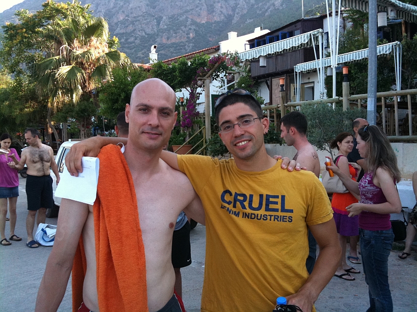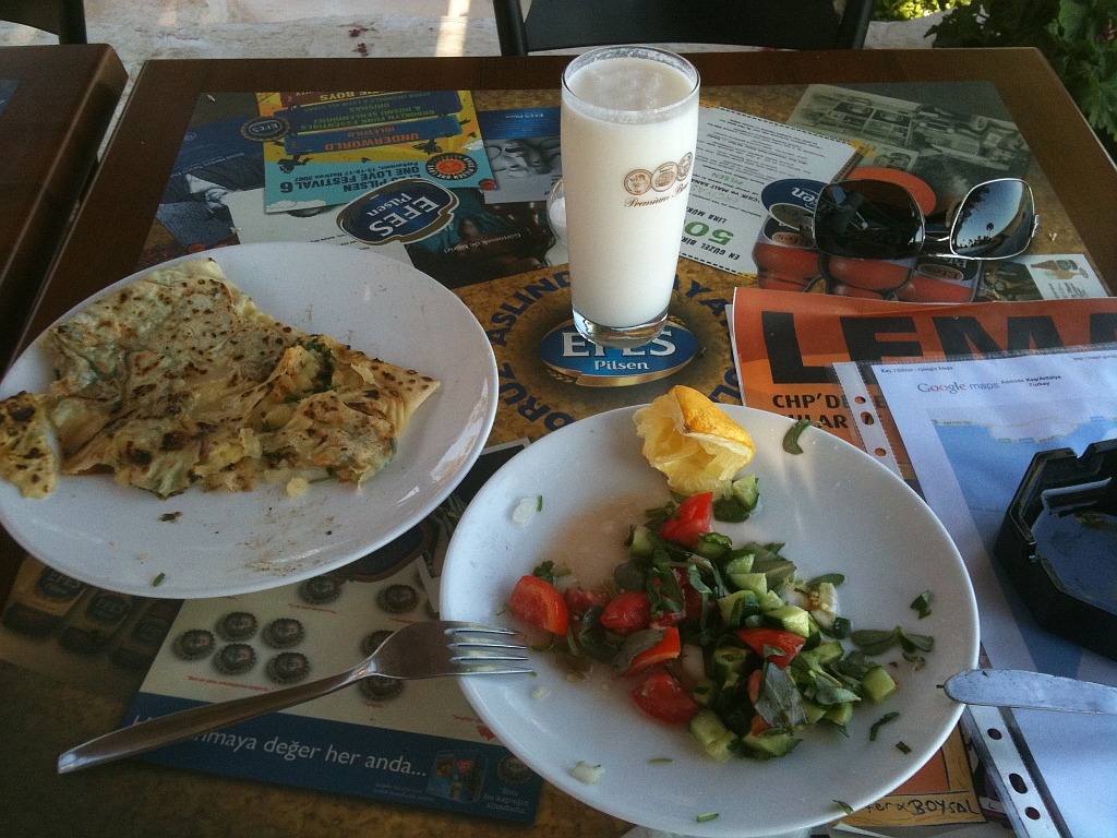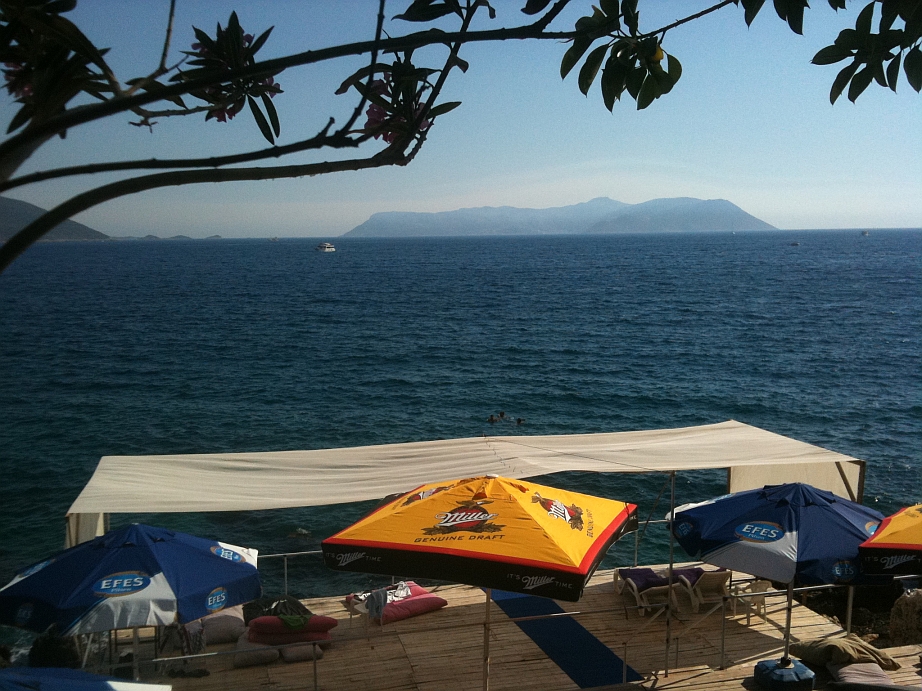 Hemen sahile inip bitiş noktasını sorarak buldum ve oradaki Çay Bahçesinde Meis adasını seyrederek harika bir patatesli gözleme ve çoban salatasını 2 ayran eşliğinde afiyetle yedim. Hemen arkamda bir grup daha yemek yiyip sohbet ediyordu. 15-16 yaşlarında bir kız, annesi ve babası, babasının bir arkadaşı yarış hakkında konuşuyorlardı. Selamlaştım, Ankara’dan gelmişler, baba 2008’de 1 kez katılmış daha önce bu yarışa. Yarış günü gördüm ki kızı ve arkadaşı da yüzmüşler, kızı kendi yaş kategorisinde 1. olmuş.